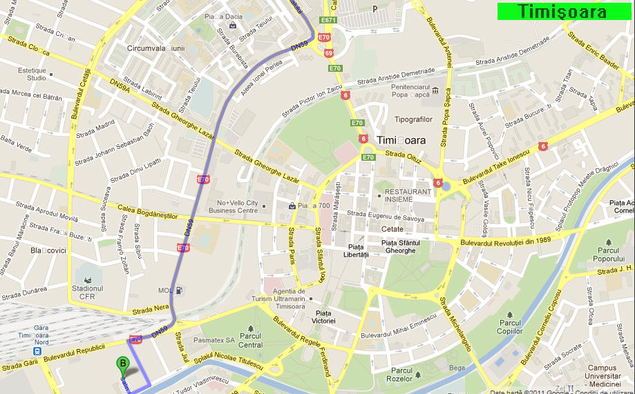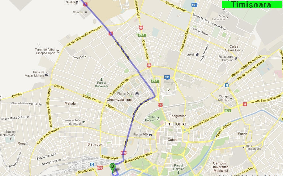 Virați la dreapta spre Calea Circumvalațiunii/DN59/E70. Treceți de intersecția semaforizată pe lângă magazinul Billa (pe partea dreaptă). Treceți pe lângă benzinăria MOL (pe partea stângă aproximativ la 1,4 km). Traversați viaductul pe sub calea ferată și intrați drept înainte în intersecția semaforizată.